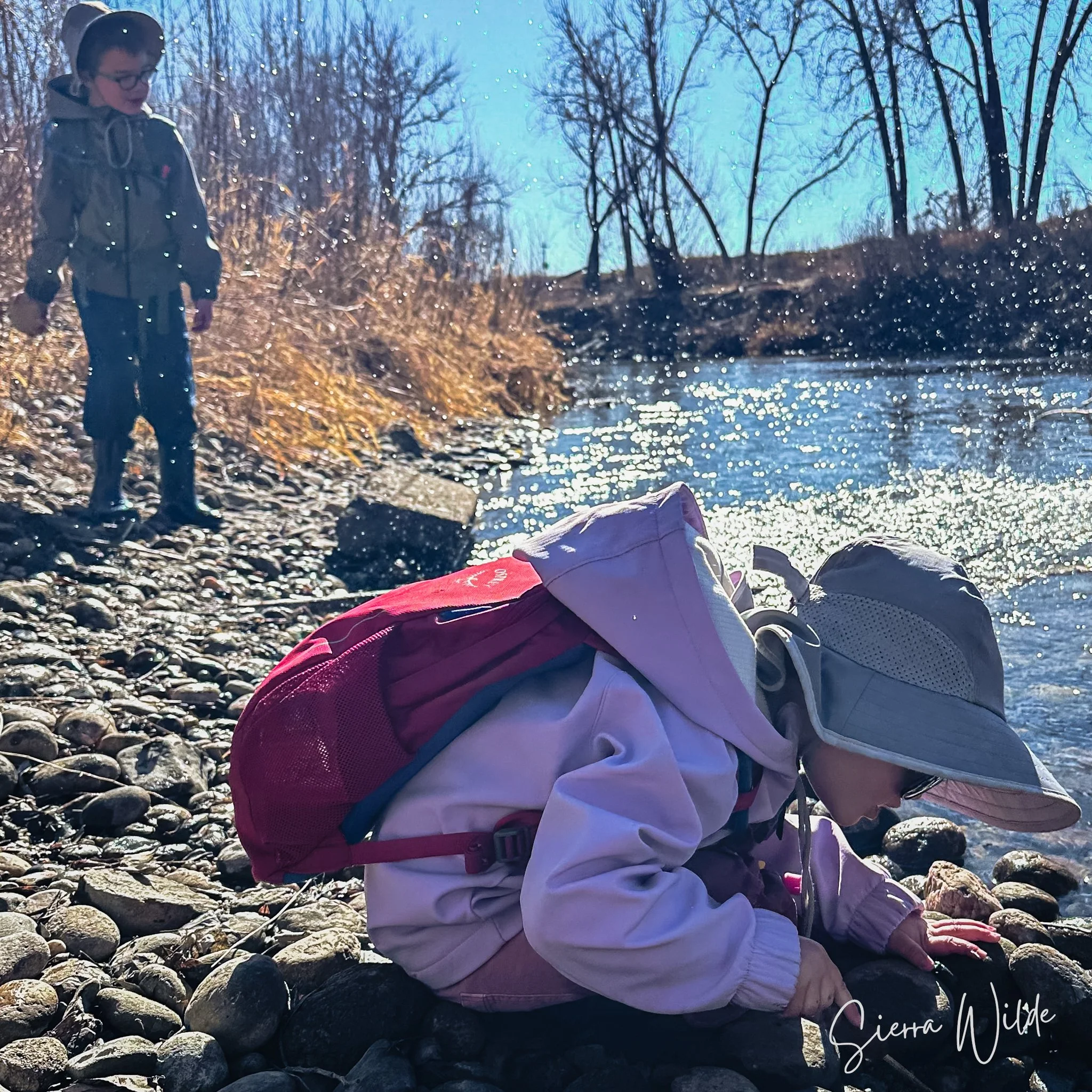 River Play: The access point offers plenty of natural "loose parts"—sticks, smooth river rocks, and water—to keep small hands busy.